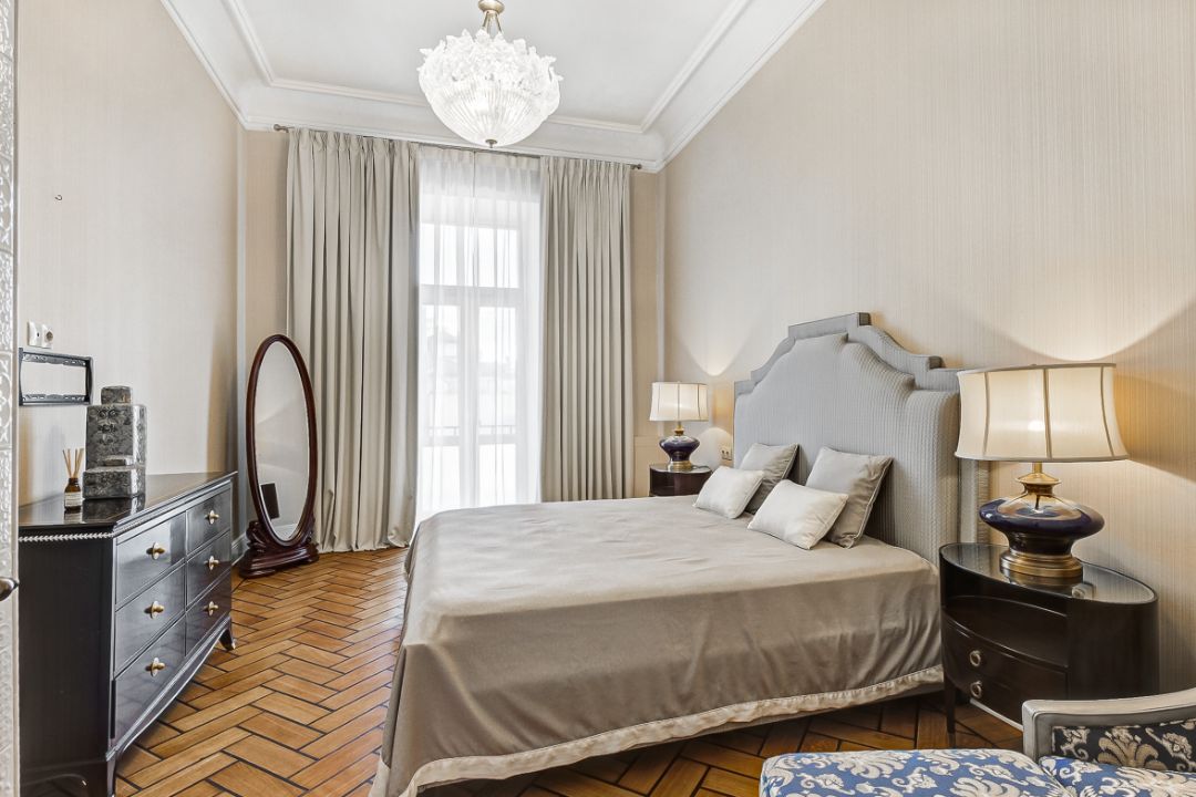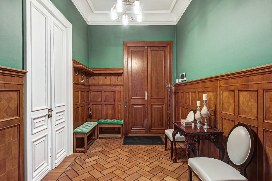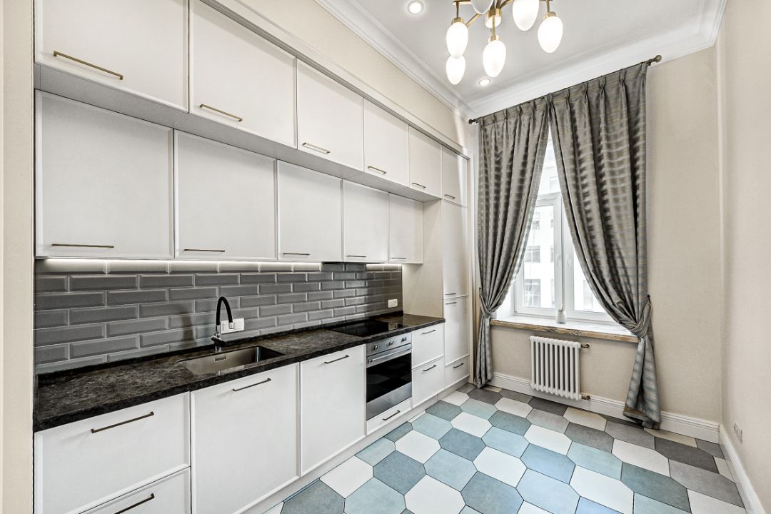 Квартира оборудована встроенной кухней и техникой, трофейной реставрационной мебелью.