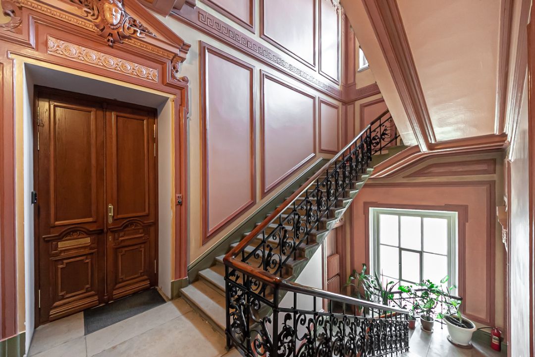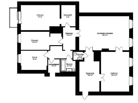 По плану обустроены просторная гостиная, кухня, 2 спальни и кабинет, который при желании можно переоборудовать в еще одну спальню, 2 санузла. Особое обаяние квартире придают высокие потолки 3.8 м. До самого вечера пространство наполнено воздухом и светом!